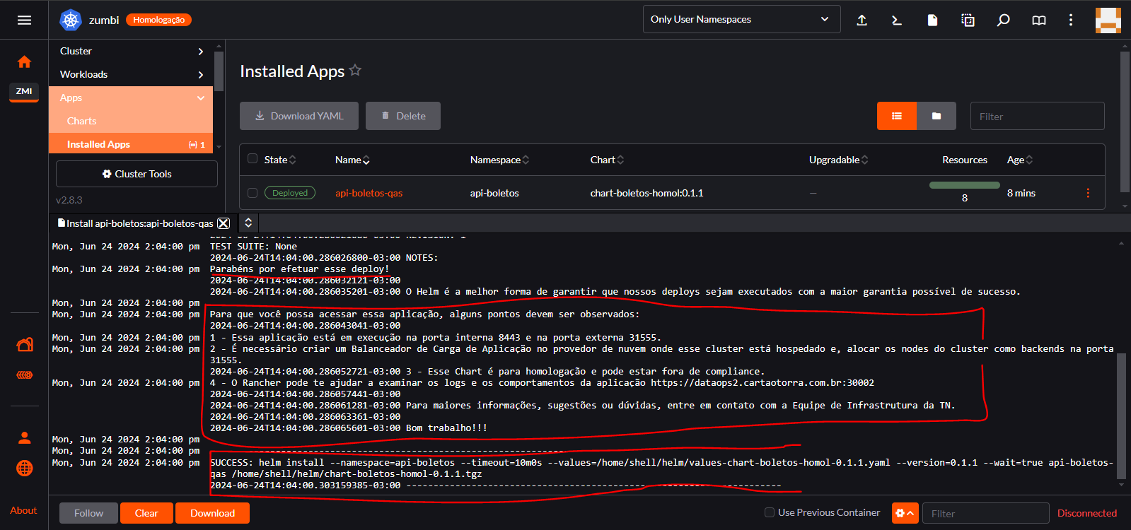 Siga os passos descritos abaixo para acessar o Rancher do TACC e instalar o Chart da API de Boletos no ambiente de Homologação.