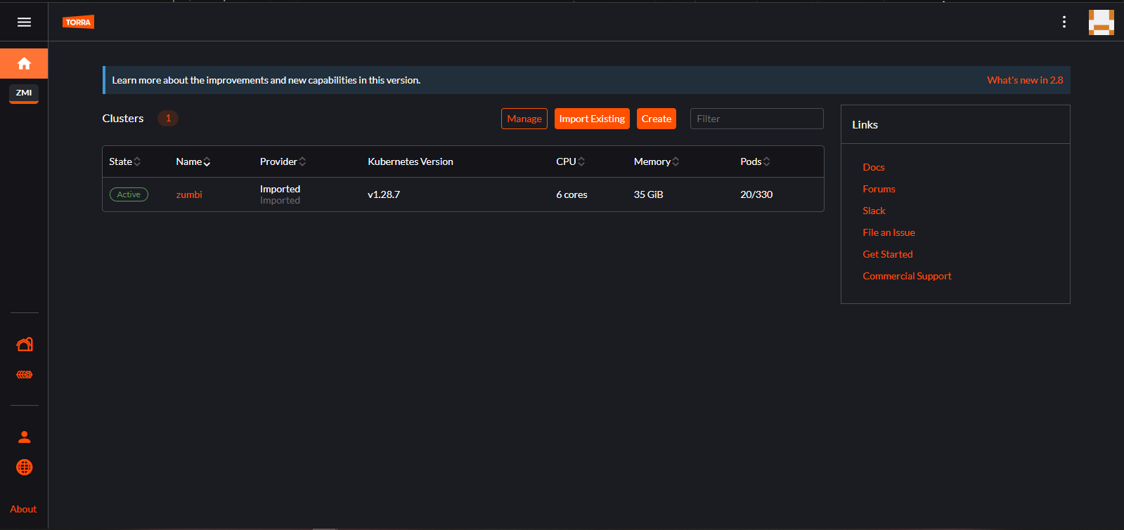 2 – Na tela a seguir temos as listas dos clusters gerenciados pelo Rancher dos quais o seu usuário possui permissões. No nosso caso estamos visualizando apenas o cluster Zumbi onde rodam nossas aplicações em Homologação. Clique no cluster Zumbi.