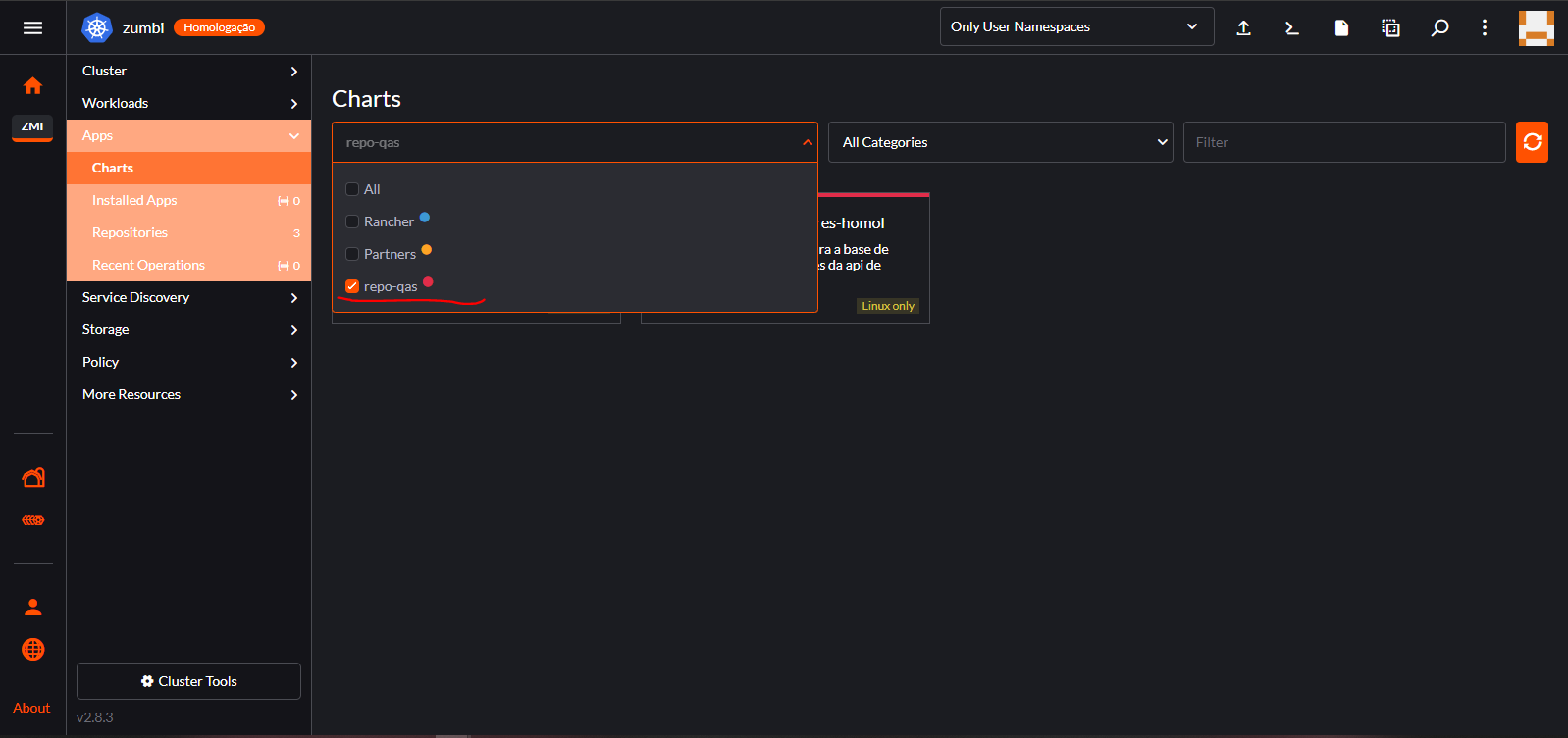 4 – Ao clicar em Apps o menu se abrirá na opção Charts. Essa opção mostrará todos os Charts existentes por padrão no Rancher para a instalação de componentes adicionais. Filtre os Charts conforme a imagem abaixo para selecionar apenas os Charts do repositório referente ao ambiente de Homologação repo-qas.