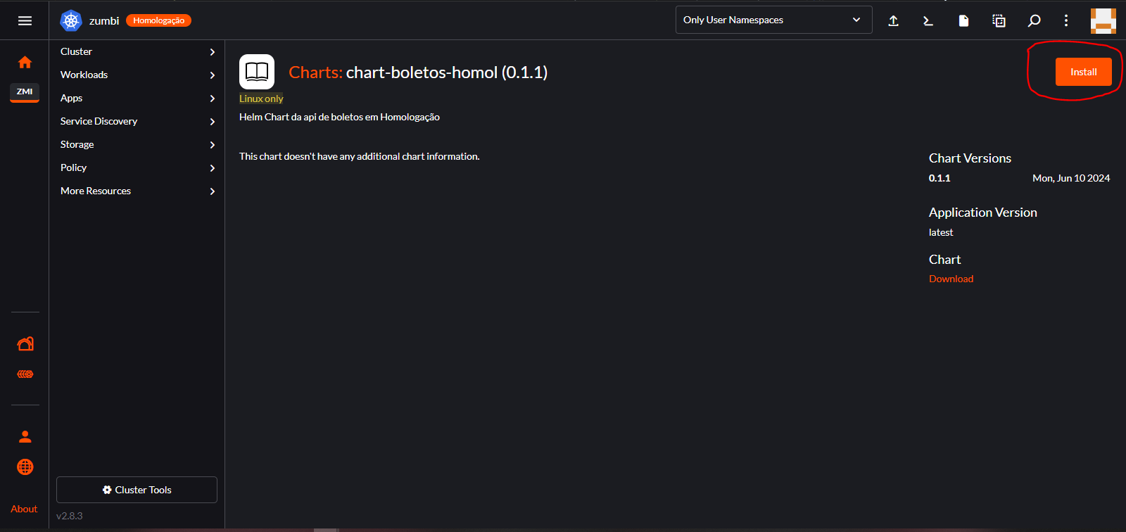 6 – Ao clicar no Chart você verá a descrição da instalação e algumas informações adicionais sobre o Chart em questão. No canto superior direito clique no botão Install.