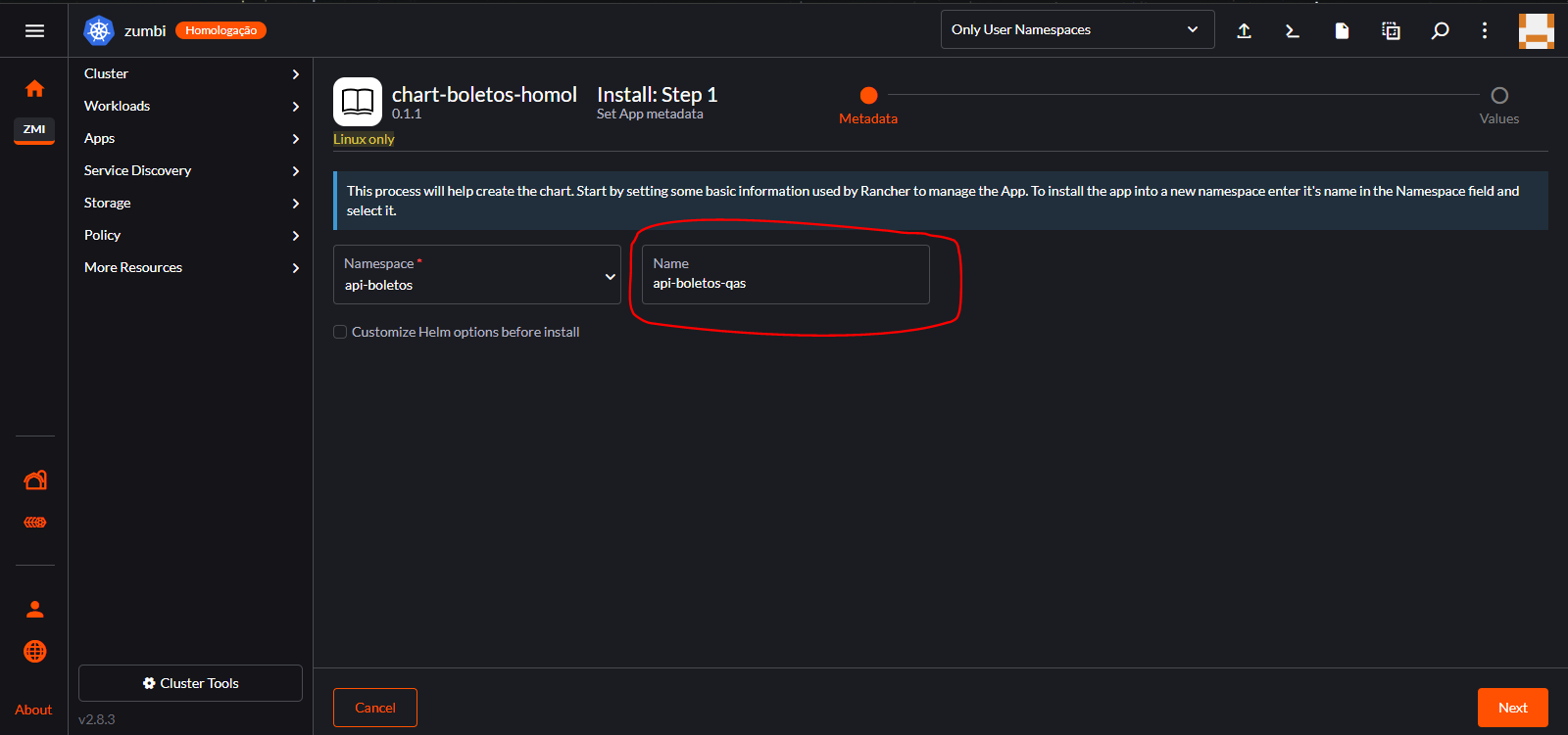 7 – Ao clicar em Install você precisará definir um nome amigável para identificar o deploy dentro do cluster. Em nosso exemplo concedemos o nome como api-boletos-qas, mas você pode nomear o deploy como preferir. Seja coerente com a nomenclatura para que a mesma expresse o sentido do que está sendo executado pelo deploy. Da mesma forma deve ser selecionado o namespace. Só aparecerão os namespaces do projeto do qual seu usuário possui permissionamento.