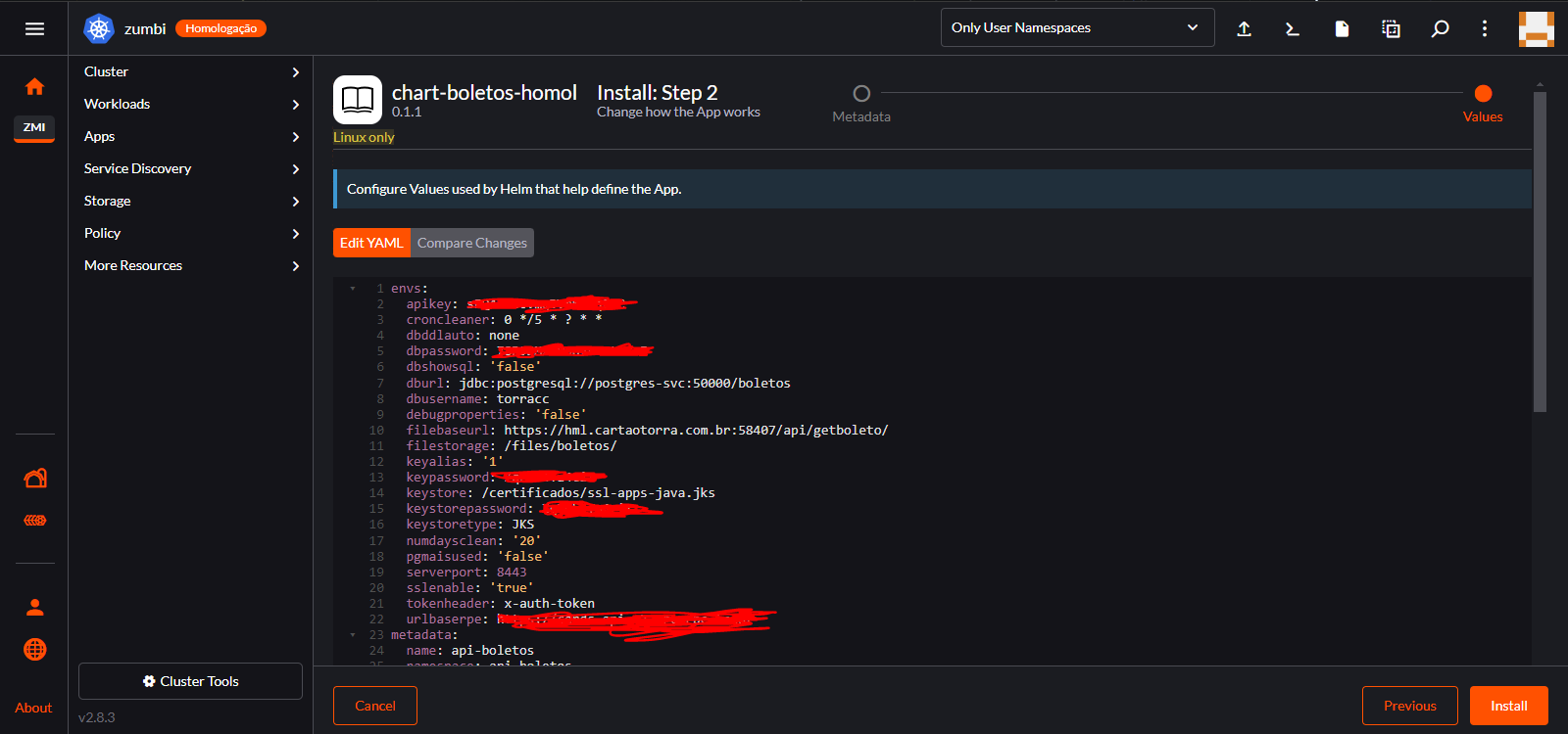 9 – Após selecionar o namespace e conceder um nome à aplicação, clique em Next no canto inferior direito da tela. Será exibida a tela para a manipulação do values do Chart que será instalado. Veja na imagem que todo o arquivo values está sendo exibido e pode ser manipulado nesta tela. Caso queira modificar algo do deploy original, esse é o momento certo.