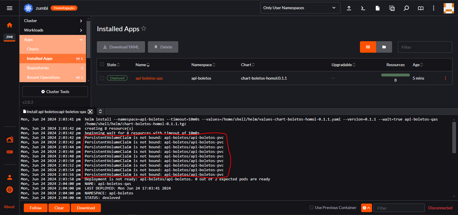 10 – Após manipular o values, caso tenha havido a necessidade, clique em Install no canto inferior direito da tela. Ao clicar em Install você poderá ver o log em tempo real da tentativa de instalação. Perceba na parte em destaque da imagem que o Helm está aguardando o armazenamento antes de continuar levantando o restante dos recursos.